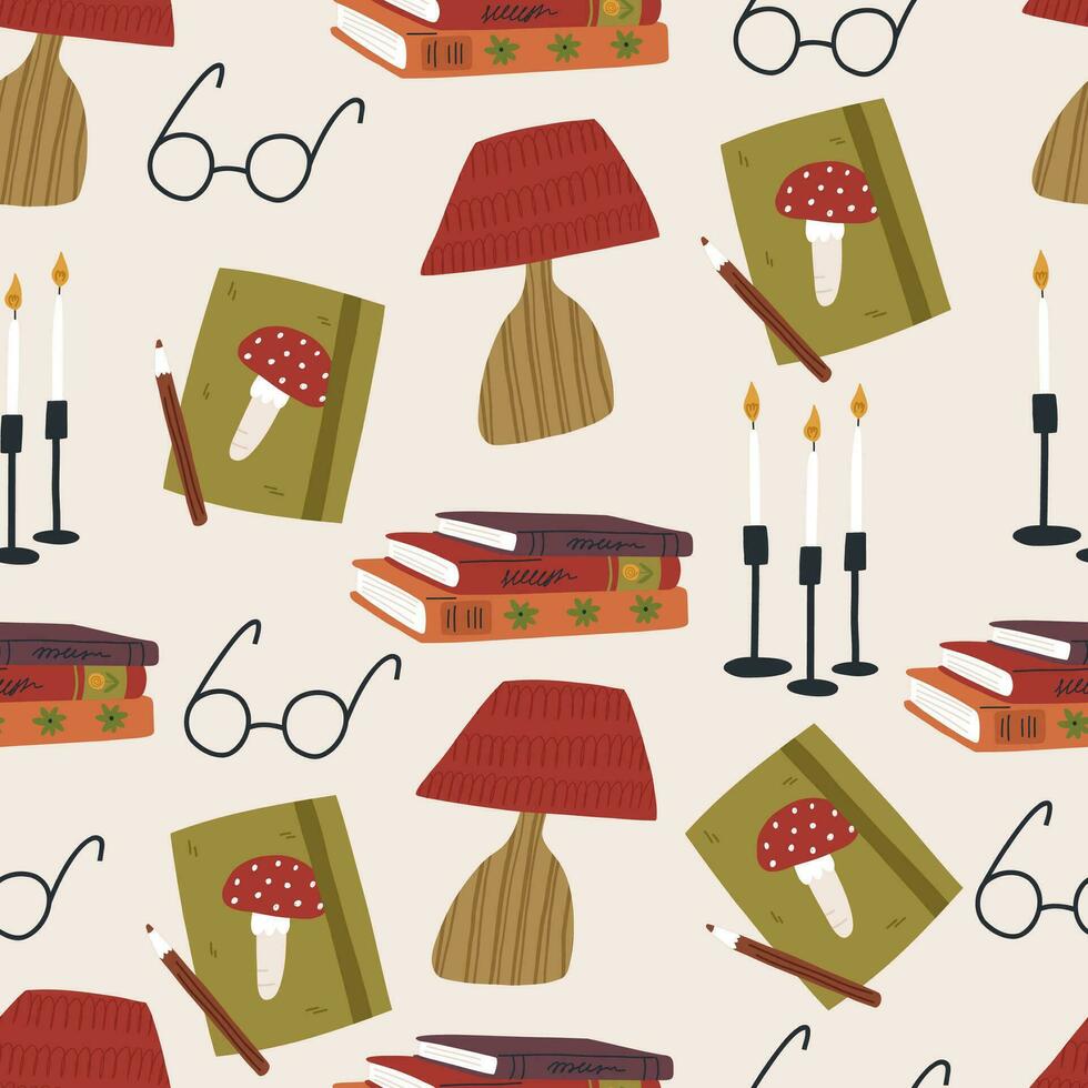 Reading concept seamless pattern on beige background. Pile of books, notebook, lamp, glasses and candles. Cozy autumn reading. Pro Vector