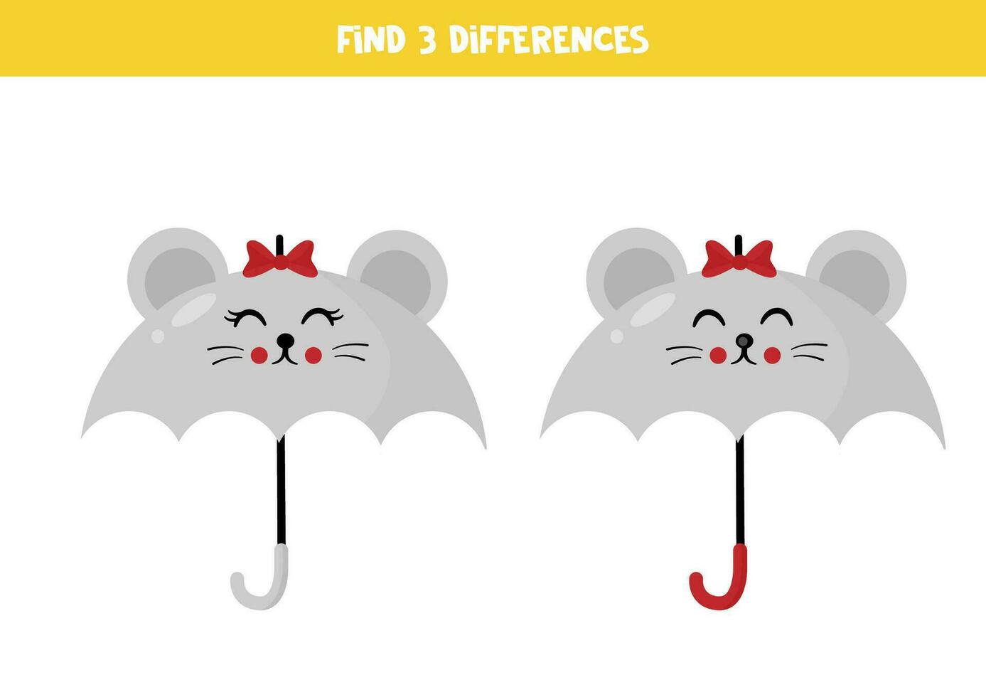 Find 3 differences between two cute cartoon umbrellas in shape of mouse. Pro Vector