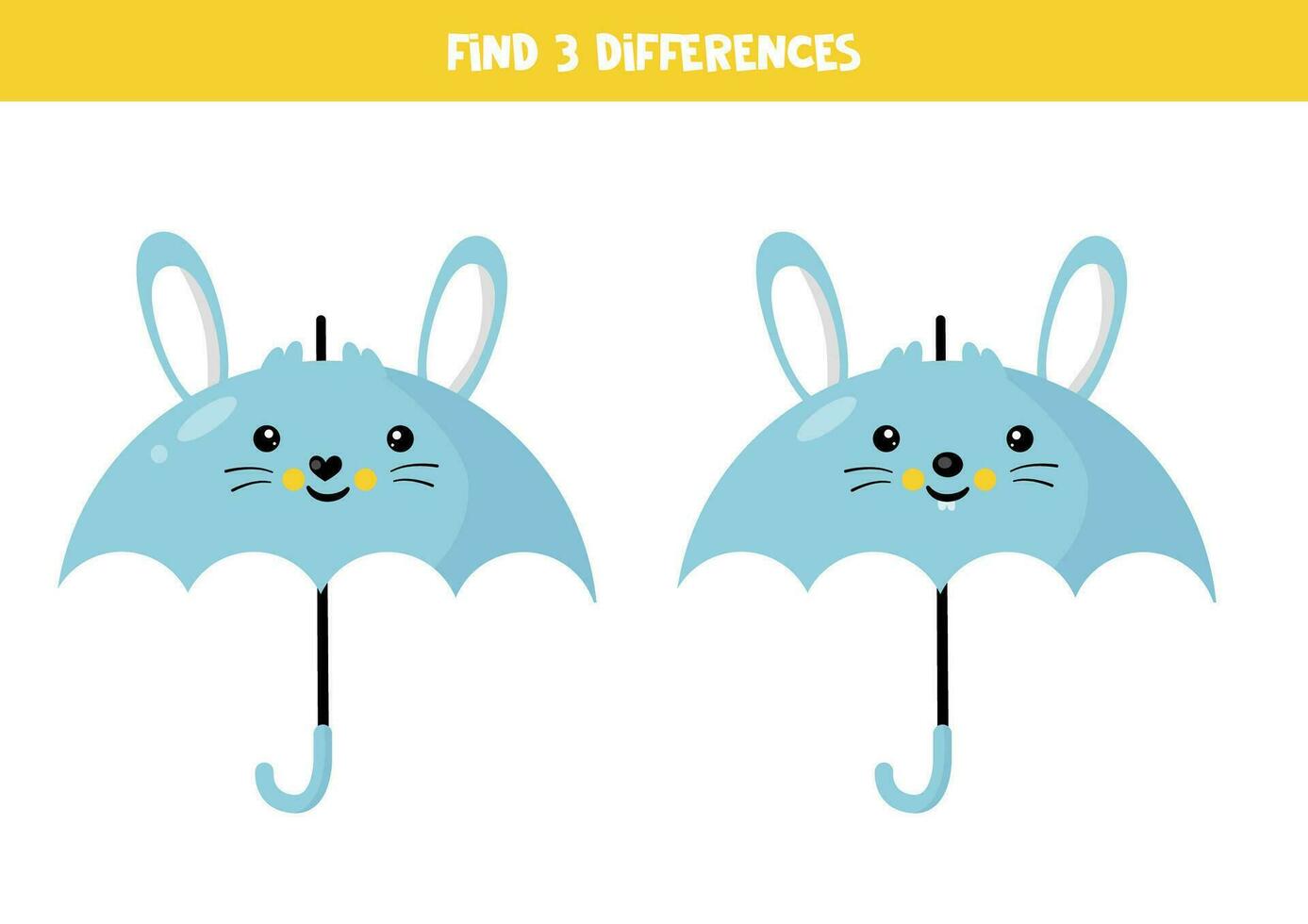 Find 3 differences between two cute cartoon umbrellas in shape of rabbit. Pro Vector