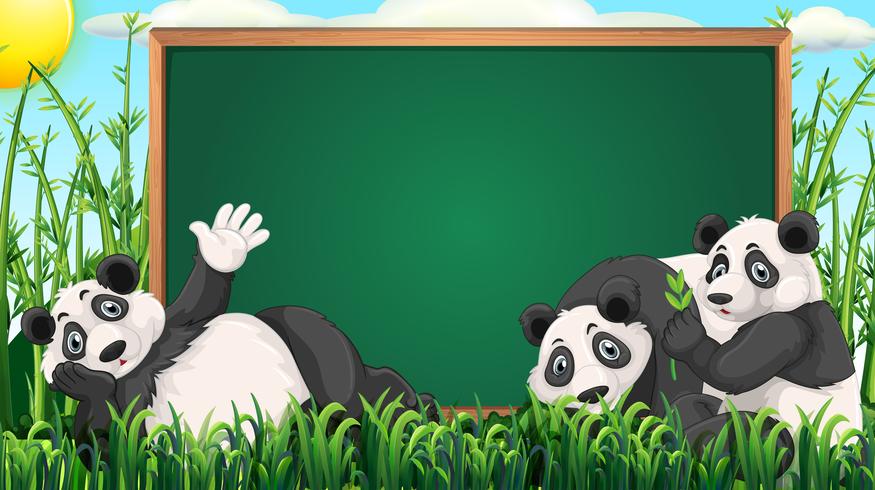 Board design with three pandas on grass Free Vector