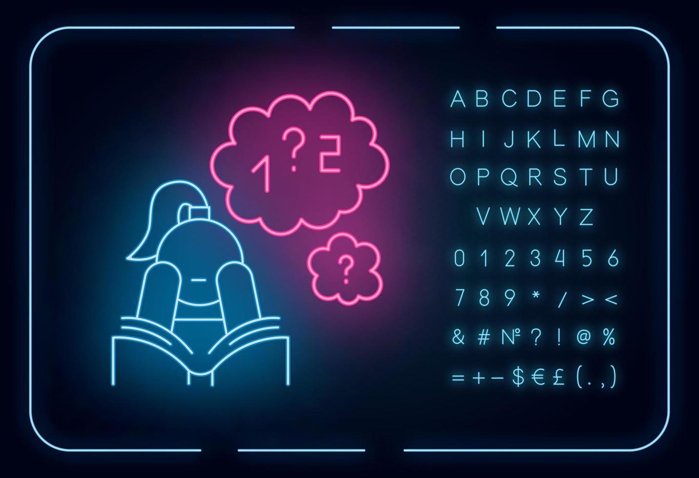Poor concentration neon light icon. Math problem solving. Algebra studying. Wandering focus. Boring read. Glowing sign with alphabet, numbers and symbols. Vector isolated illustration Pro Vector
