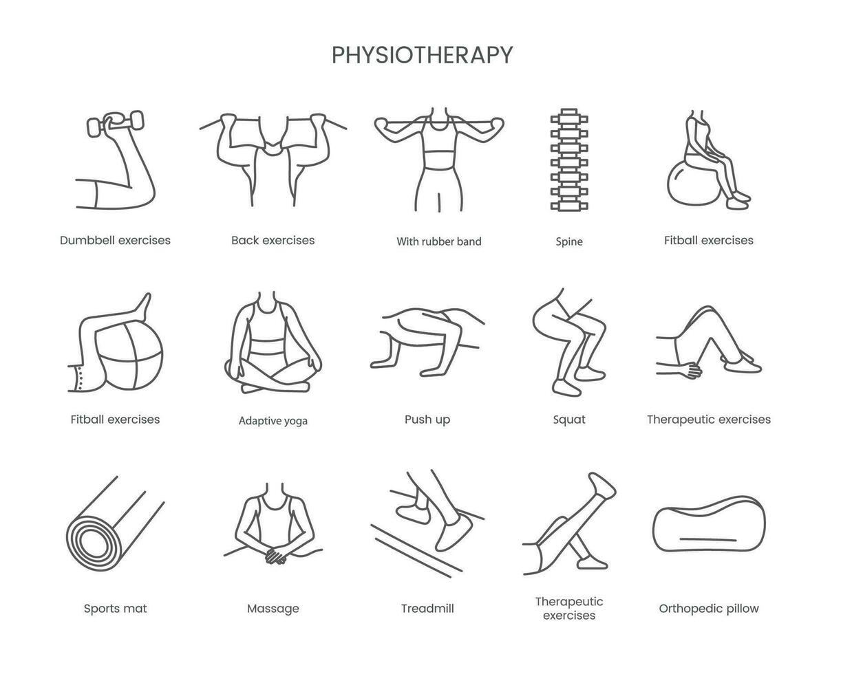 Set of icons physiotherapy, dumbbell exercises, back exercises, with rubber band, spine and fitball exercises, adaptive yoga, push up and squat, therapeutic exercises. Linear vector illustration Pro Vector