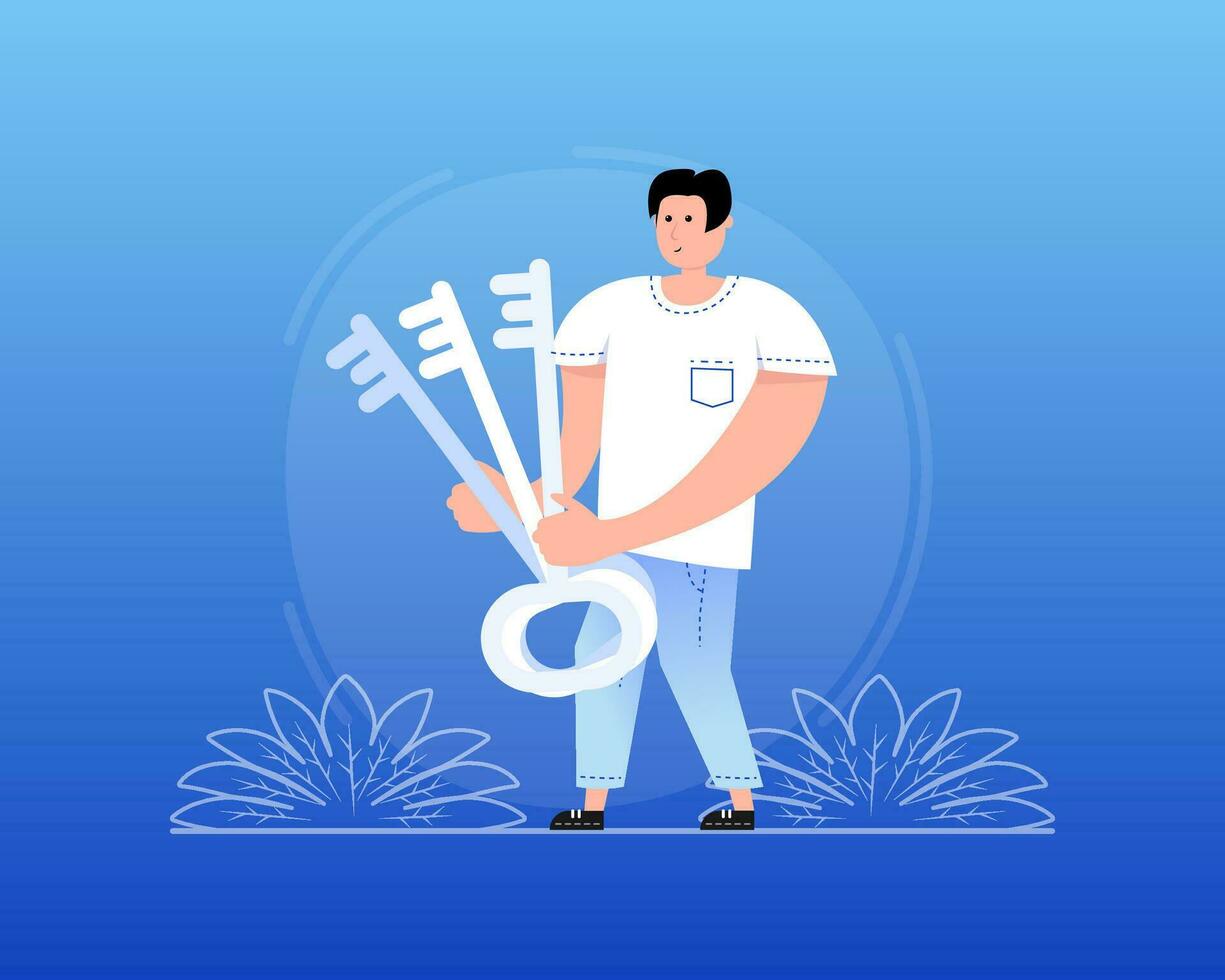 Man running with big key. Holding giant key. Open the door lock Pro Vector