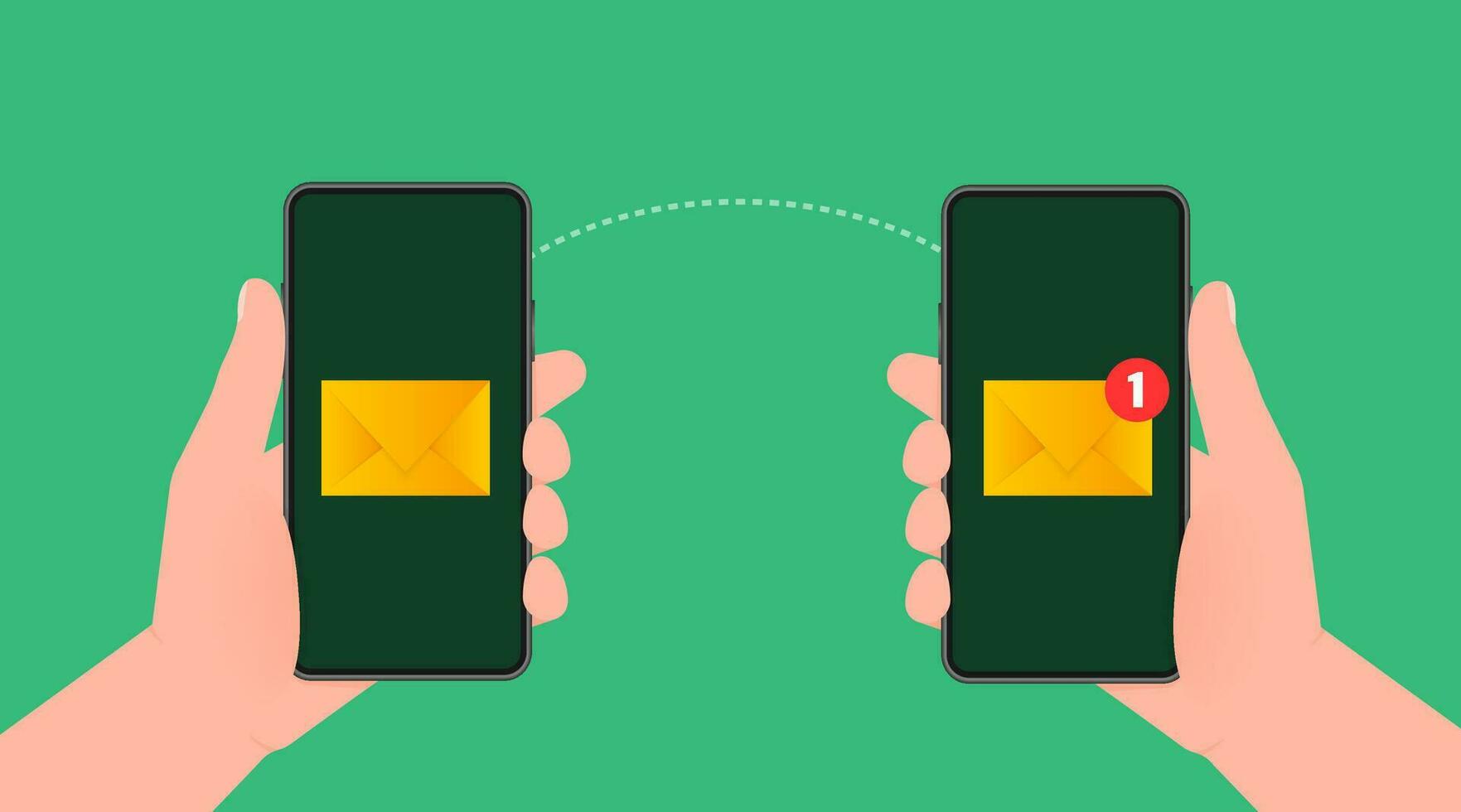 Modern flat icon with file transfer from smartphone to smartphone on green background. Document icon vector. Isometric vector. Pro Vector