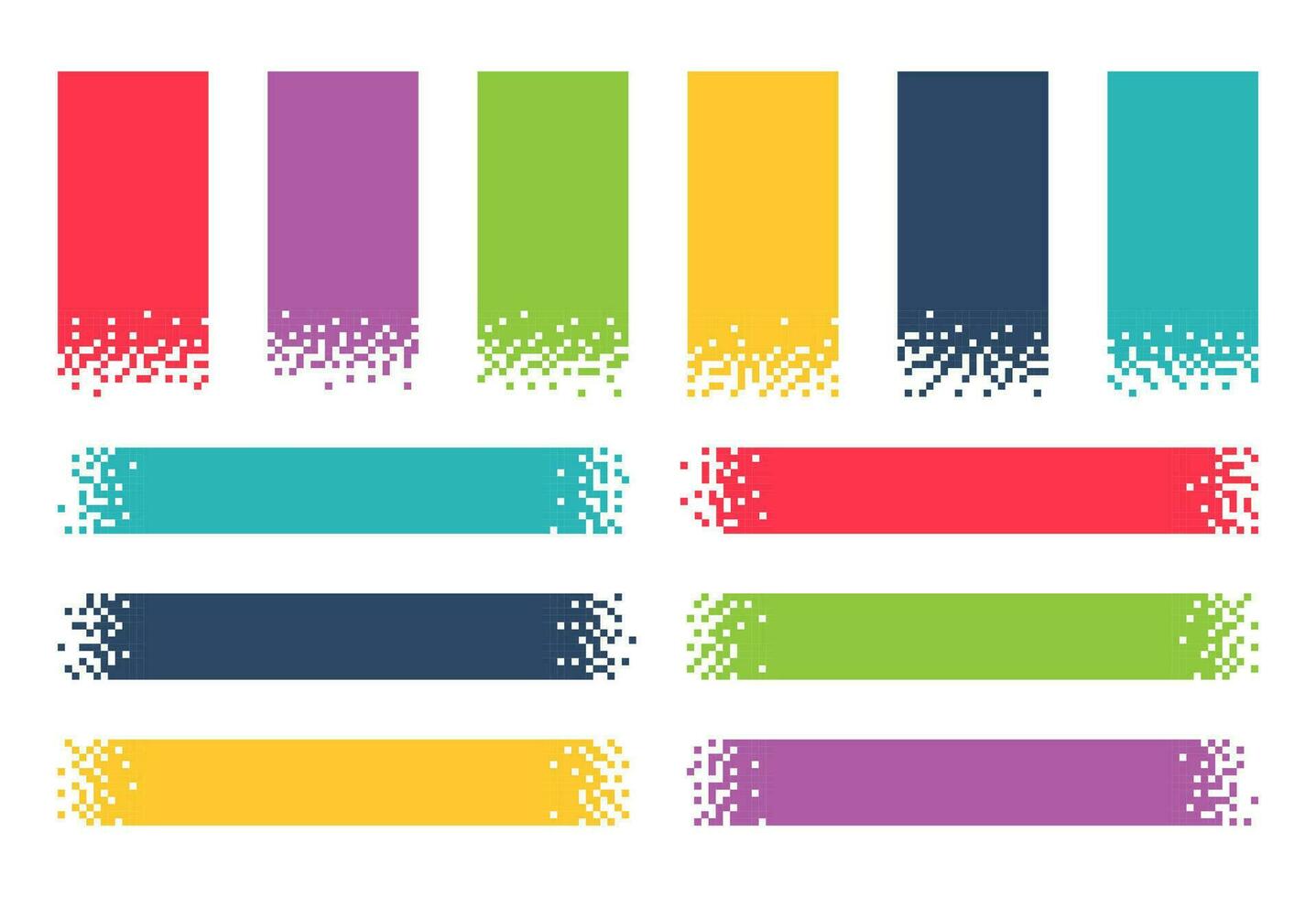 Pixel banners. Header footer banner rectangles with pixel digital edges, vertical and horizontal title boxes, pixelated gradient grunge texture vector set Pro Vector