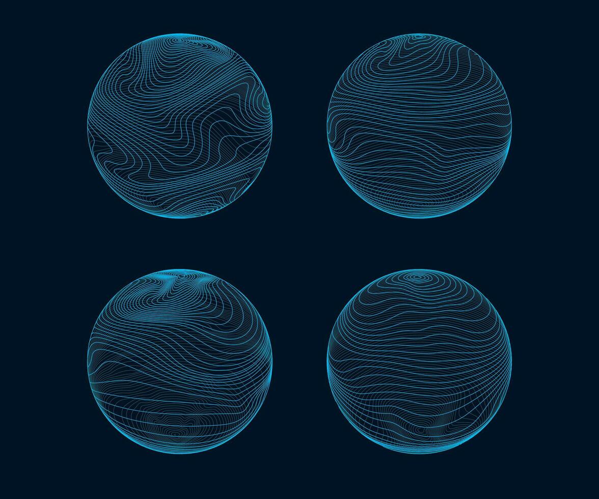 3d line sphere. Globe with wavy line pattern, futuristic digital network technology planet, 3d matrix concept. Data circles with editable stroke vector set Pro Vector