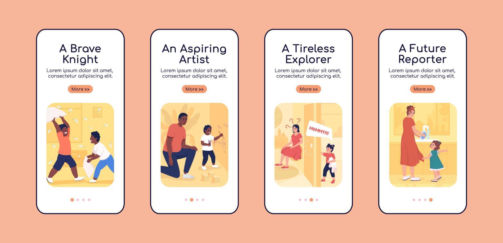 Children aspritation onboarding mobile app screen flat vector template. Walkthrough website 4 steps with characters. Growing up. Creative UX, UI, GUI smartphone cartoon interface, case prints set Pro Vector