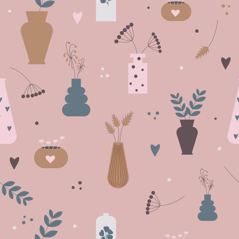 Seamless vector pattern with abstract, whimsical and dry flowers in different shape vases. Minimalistic natural and ceramic background. Pro Vector