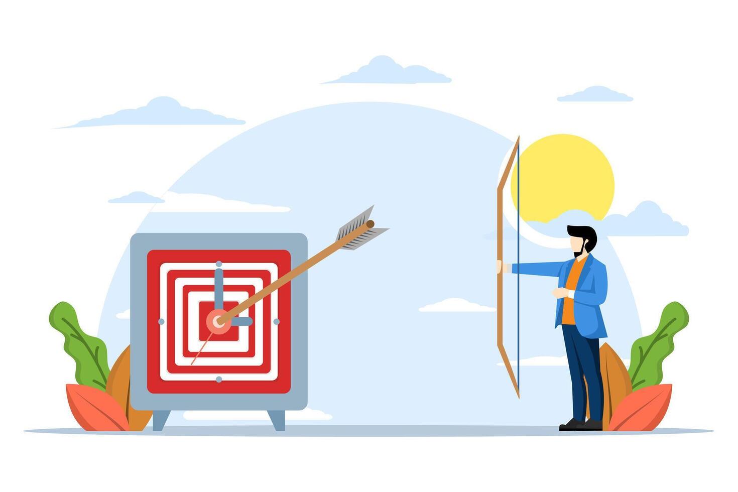 smart businessman holding bow after shooting target on alarm clock, Time management to complete work within deadline, productivity or efficiency to achieve goals, project timeline concept. Pro Vector