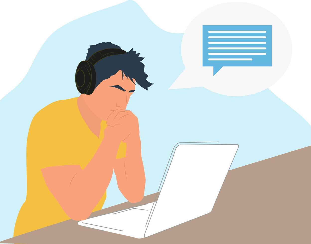 Technician at work. Man working with laptop at computer desk. Software developer, programmer or system administrator with a PC. Pro Vector
