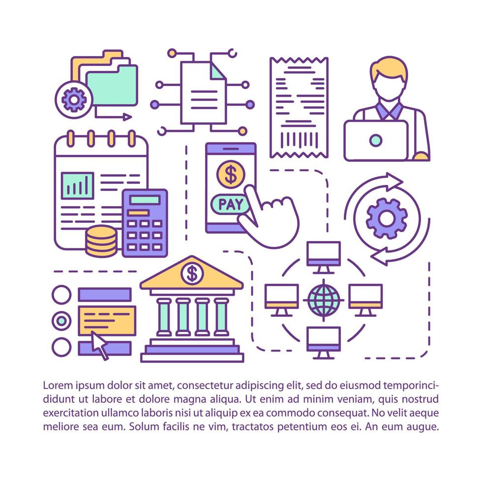 Billing service article page vector template. Cash free transaction. Brochure, magazine, booklet design element with linear icons and text boxes. Print design. Concept illustrations with text space Pro Vector