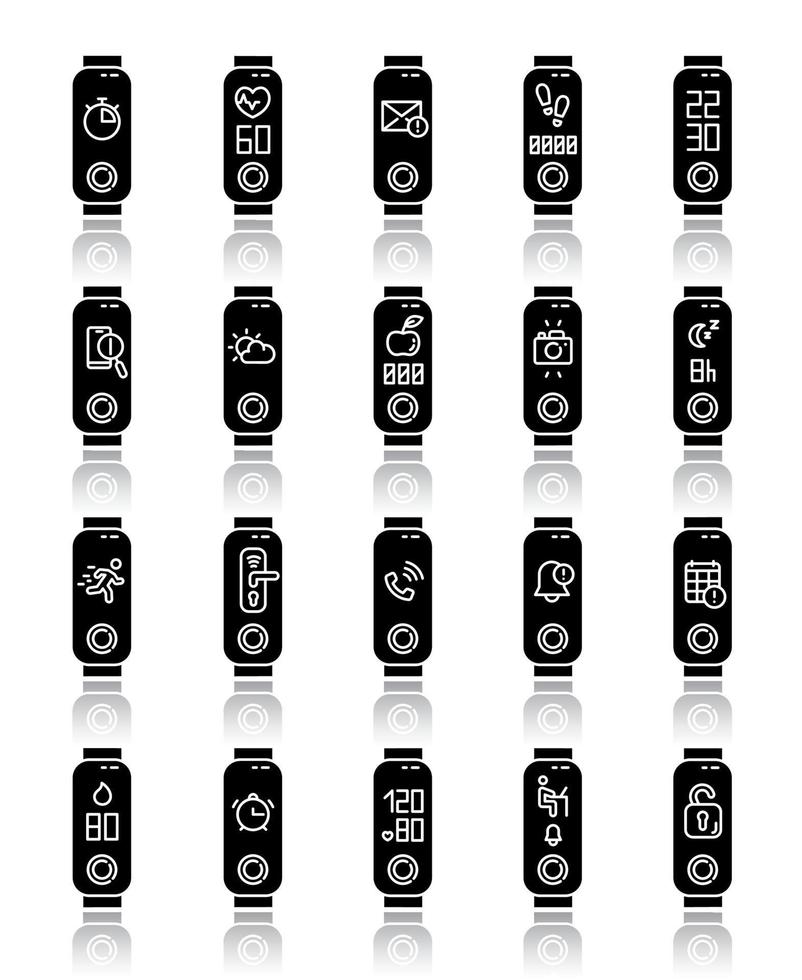 Fitness tracker functions on display drop shadow black glyph icons set. Wellness device health monitoring options. Fitness app smartphone notifications synchronization. Isolated vector illustrations Pro Vector