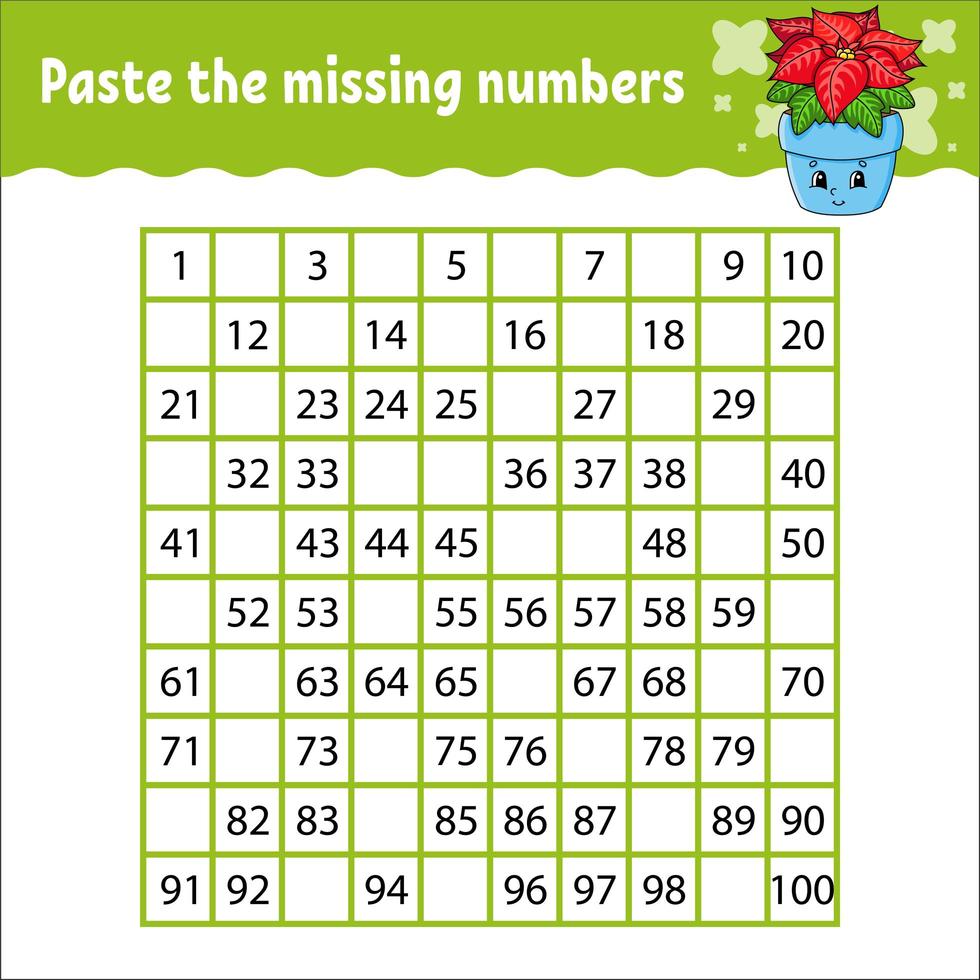 Paste the missing numbers from 1 to 100. Handwriting practice. Learning numbers for kids. Education developing worksheet. Activity page. Game for children. Isolated vector illustration. Pro Vector