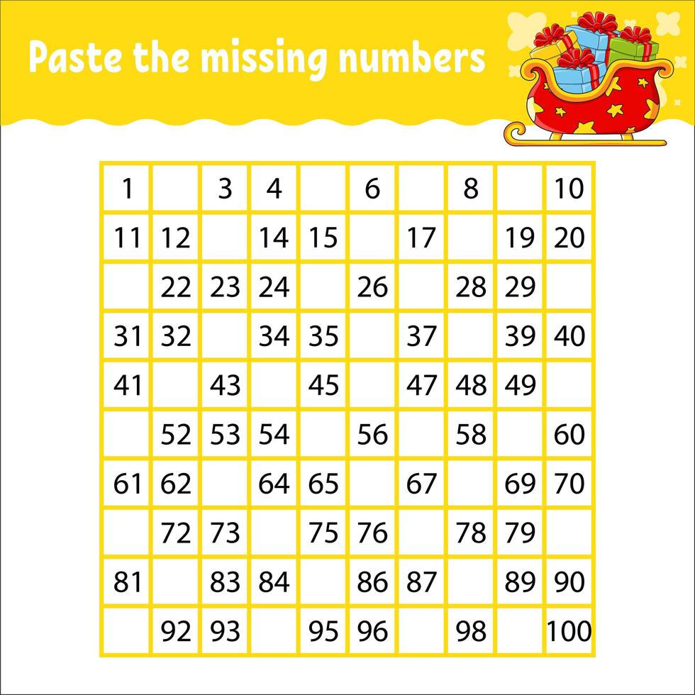 Paste the missing numbers from 1 to 100. Handwriting practice. Learning numbers for kids. Education developing worksheet. Activity page. Game for children. Isolated vector illustration. Pro Vector