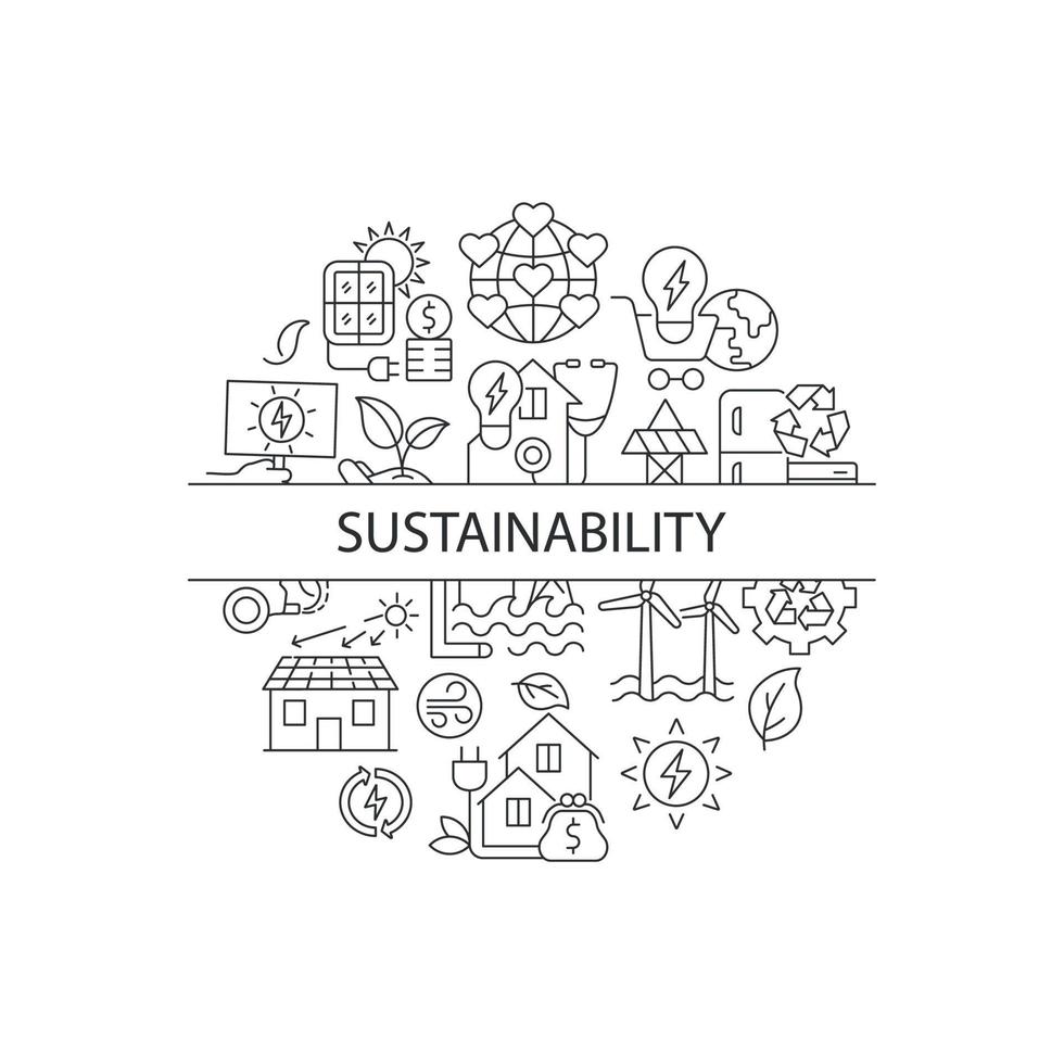 Sustainability abstract linear concept layout with headline. Power generation source. Sustainability minimalistic idea. Thin line graphic drawings. Isolated vector contour icons for background Pro Vector