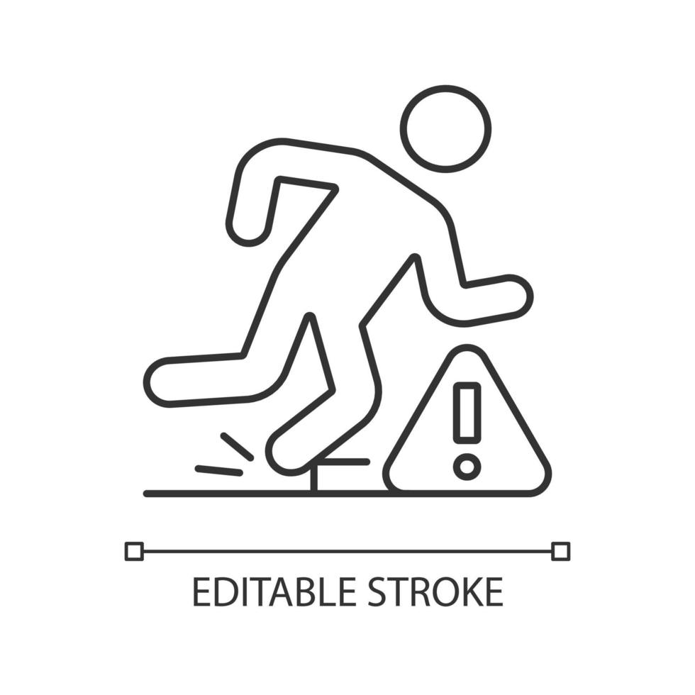 Tripping hazards linear manual label icon. Falling precautions. Thin line customizable illustration. Contour symbol. Vector isolated outline drawing for product use instructions. Editable stroke Pro Vector