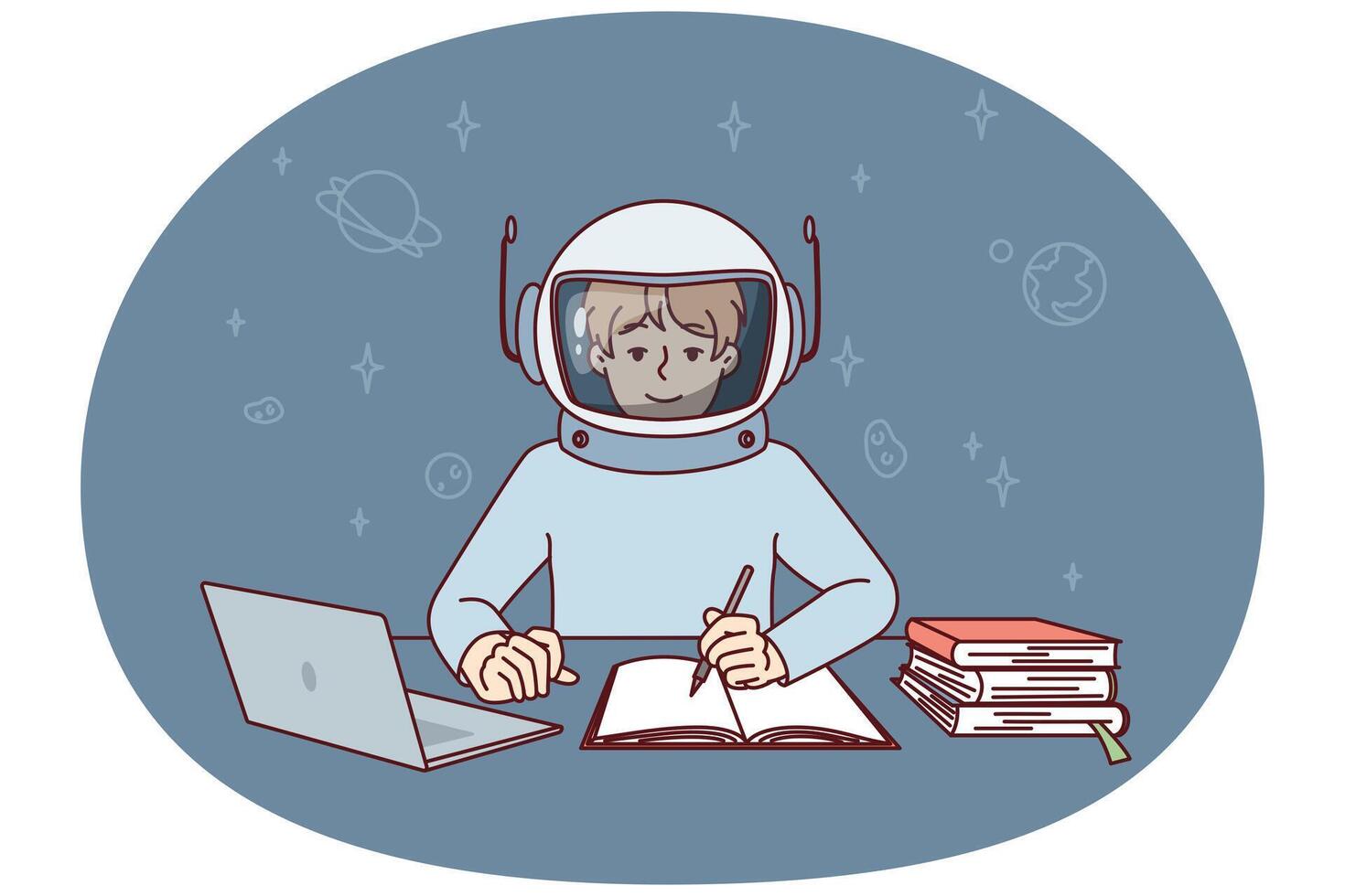 Boy in spacesuit sits at table with laptop and textbooks making notes in workbook. Vector image Pro Vector