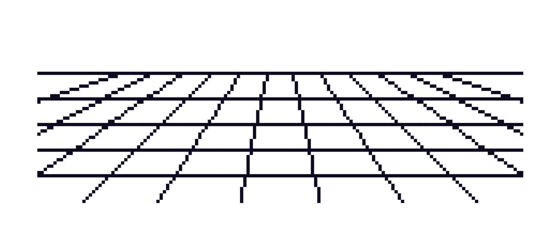 Pixel black perspective mesh template. Digital blank surface with techno curve grid lines in 80s electronic style with simple vector design Pro Vector