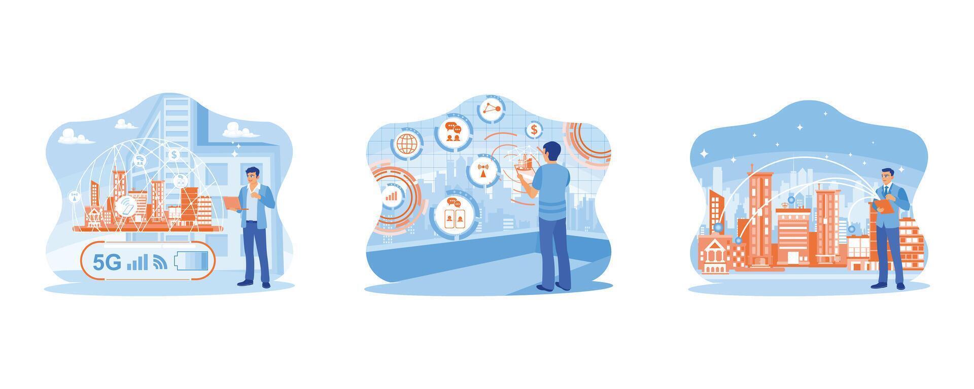 Telecommunication and internet in smart city concept. Creative internet with 5G wireless network. Smartphone with telecommunications network. Using a digital tablet with the business network. Pro Vector