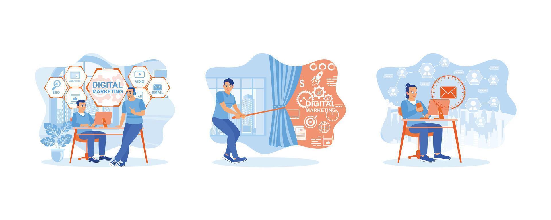 Computer programmer and manager. Man pulling rope and making business marketing concepts on the wall. Direct sales schemes in business. set flat vector illustration. Pro Vector