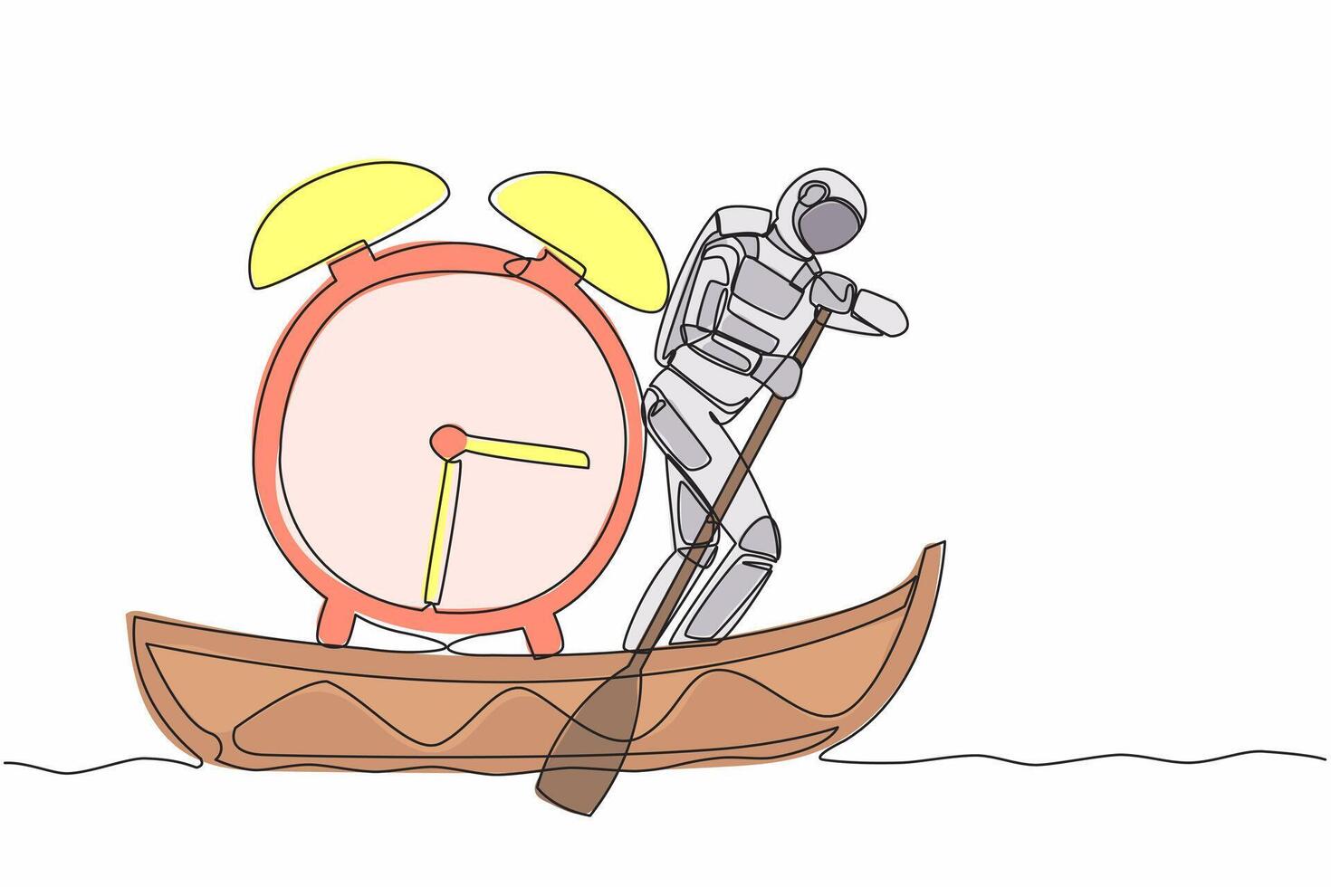 Continuous one line drawing of young astronaut sailing away on boat with alarm clock. Time management in launch spaceship mission. Cosmonaut outer space. Single line design vector graphic illustration Pro Vector