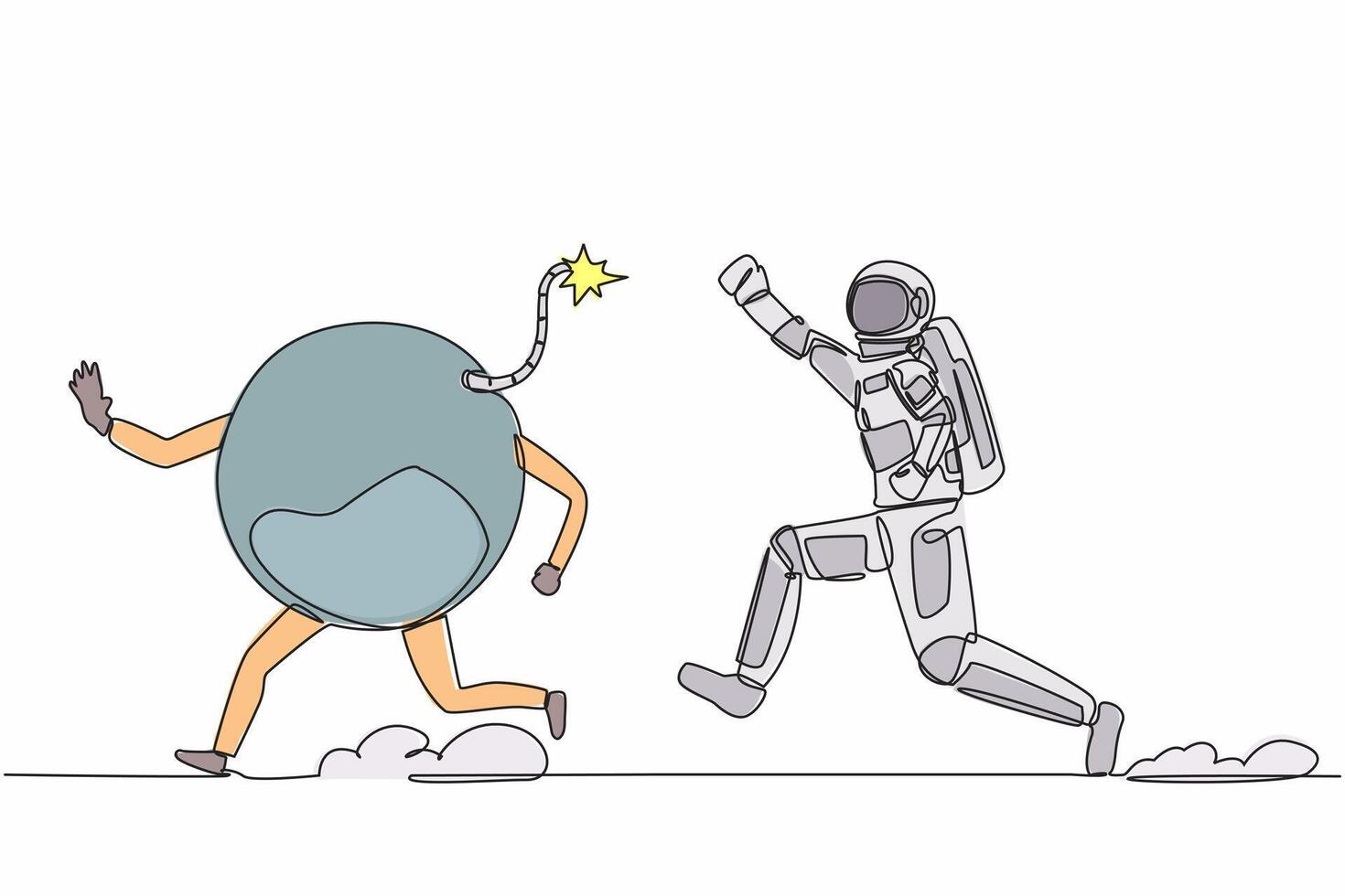 Single continuous line drawing astronaut run chasing bomb in moon surface. Closed spaceship company due to exploding financial crisis. Cosmonaut deep space. One line design vector graphic illustration Pro Vector