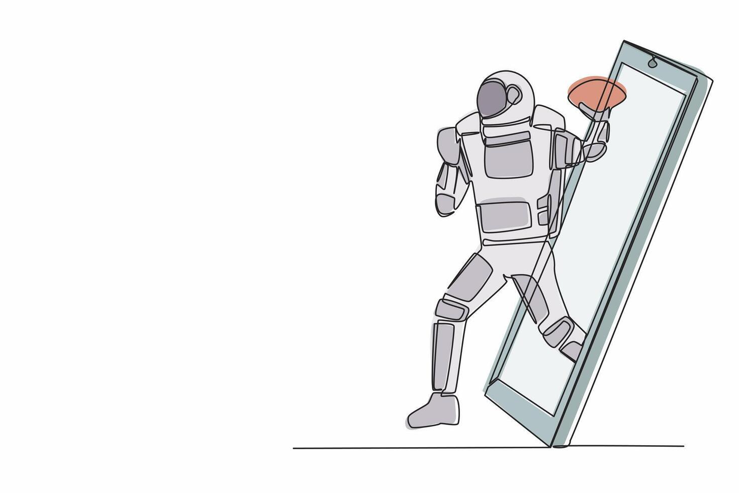 Single one line drawing of american football astronaut player running getting out of smartphone screen. Cosmic galaxy space. Online game mobile app. Continuous line graphic design vector illustration Pro Vector