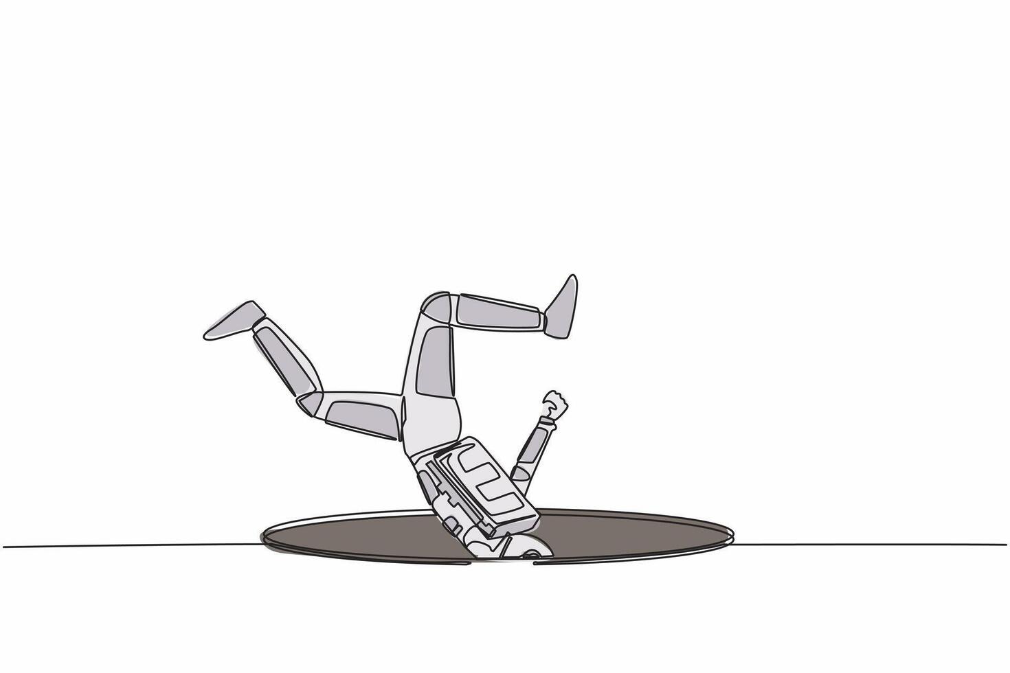 Continuous one line drawing astronaut falling into deep hole. Protruding legs from hatch. Failure in spaceship galactic expedition. Cosmonaut outer space. Single line draw design vector illustration Pro Vector