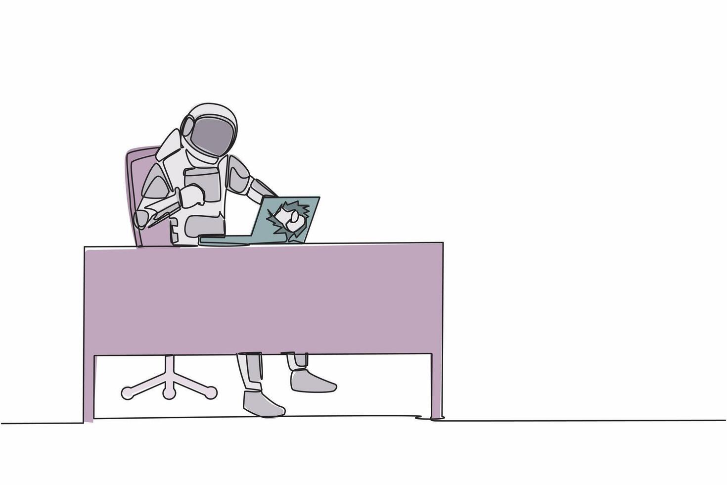 Single one line drawing of angry young astronaut breaks his laptop computer hitting it with clenched fist at working desk. Cosmic galaxy space. Continuous line draw graphic design vector illustration Pro Vector