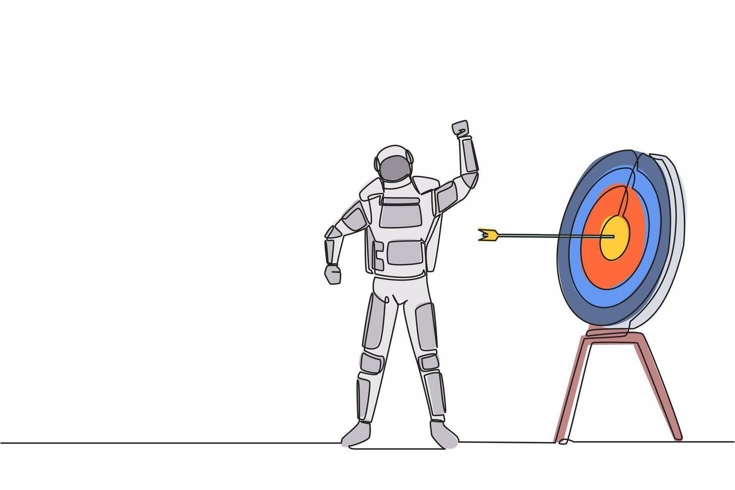 Continuous one line drawing astronaut with fist gesture in front of target board. Successful in complicated wormhole expedition. Cosmonaut outer space. Single line graphic design vector illustration Pro Vector