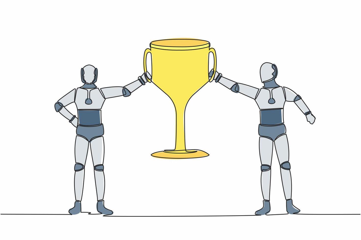 Single one line drawing two robots holding golden trophy together. Winners team celebrating victory. Artificial intelligence machine learning process. Continuous line draw design vector illustration Pro Vector