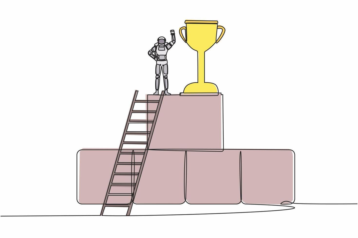 Single one line drawing astronaut climb ladder and standing with fist up gesture on big graphic bar beside huge trophy. Celebrate success space exploration. Continuous line design vector illustration Pro Vector
