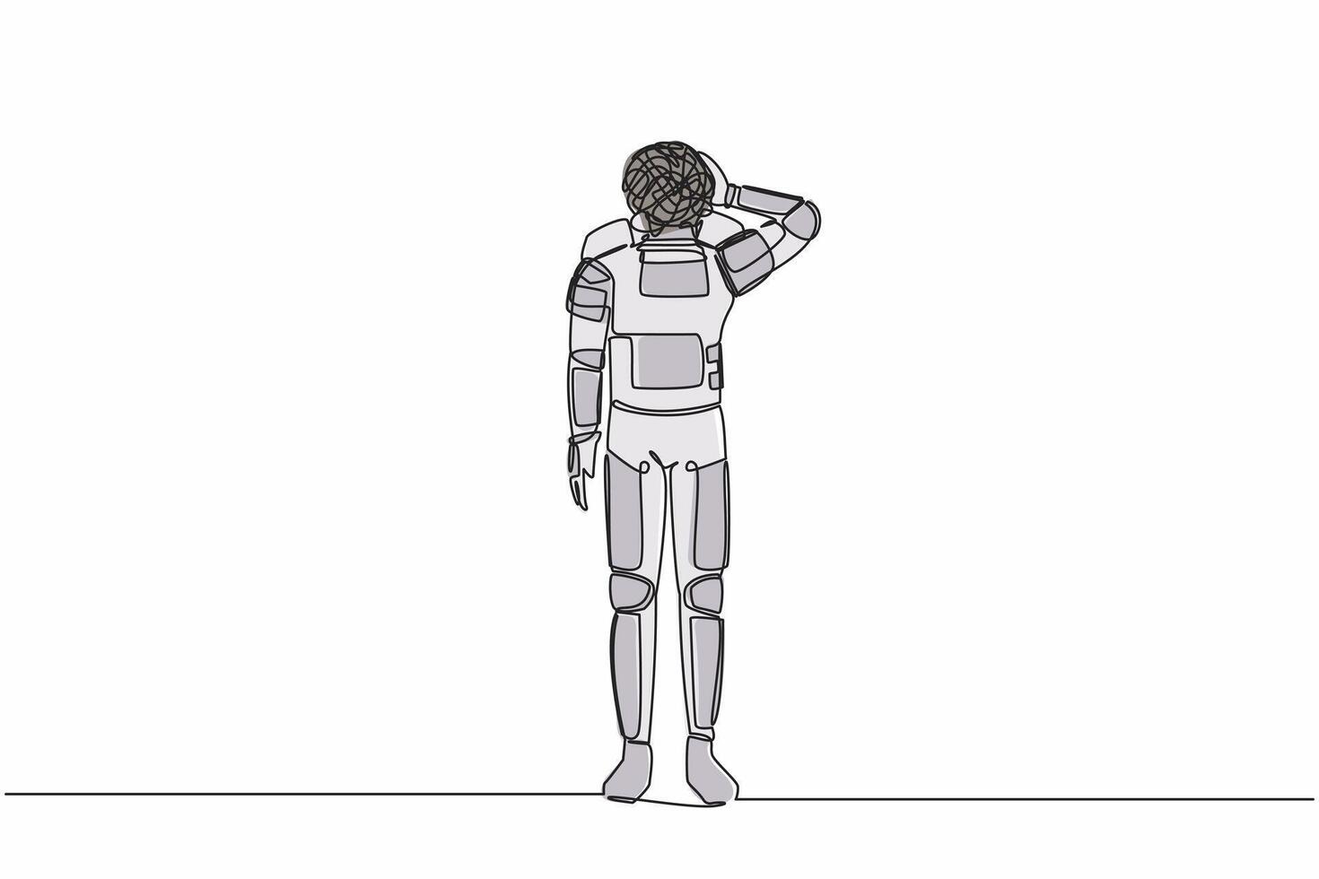 Single continuous line drawing young astronaut with round scribbles instead of head, suffer headache, workload in space industry. Cosmonaut deep space. One line draw graphic design vector illustration Pro Vector