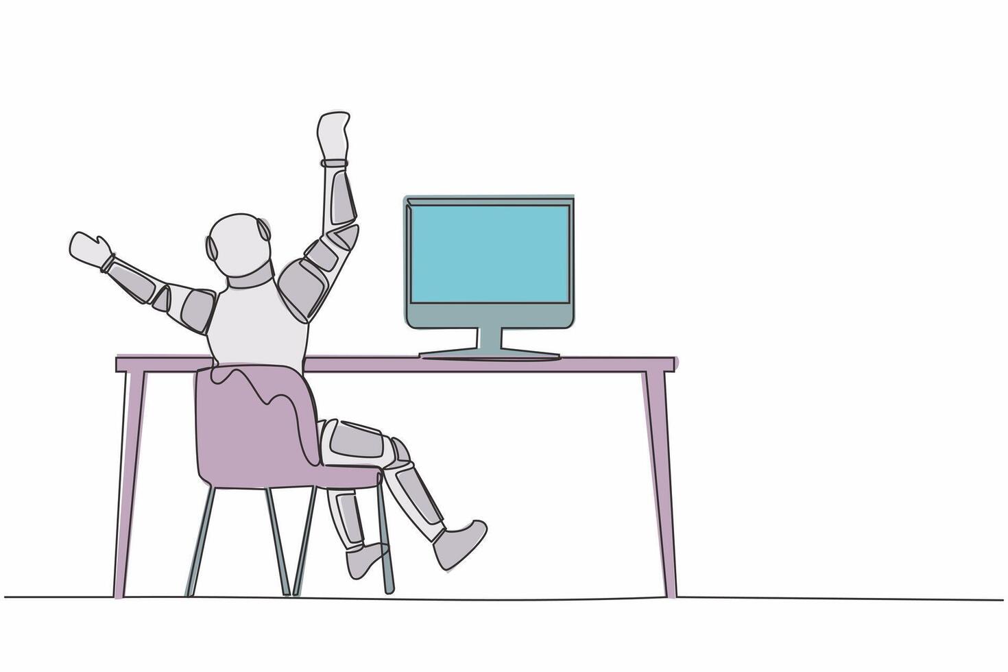 Single one line drawing back view of happy astronaut completed task and triumphing with raised hand on desk. Success space company. Cosmic galaxy space. Continuous line draw design vector illustration Pro Vector
