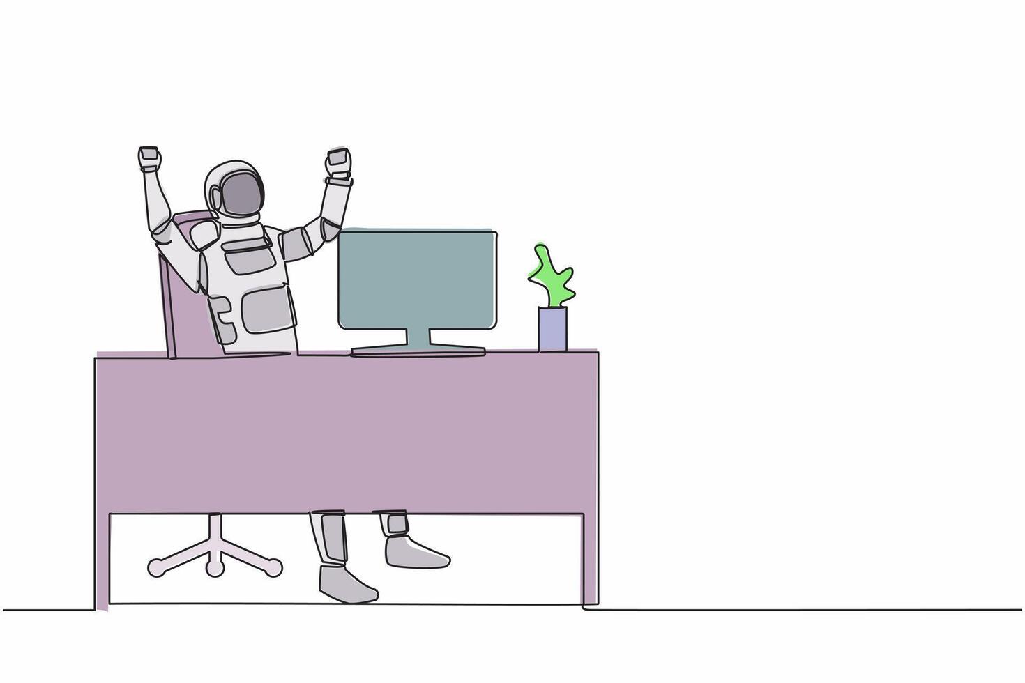 Single one line drawing happy astronaut sitting with raised hands near desk computer. Successful launch spaceship rocket. Cosmic galaxy space. Continuous line draw graphic design vector illustration Pro Vector