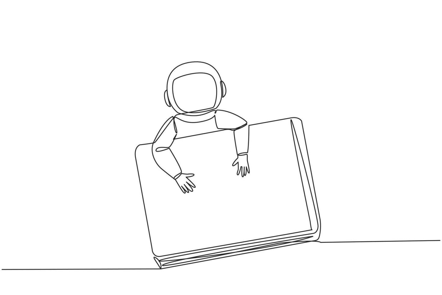 Continuous one line drawing young astronaut hugging laptop. Prepare to transmit data needed by team on earth. Processing of water discovery data on moon. Single line draw design vector illustration Pro Vector