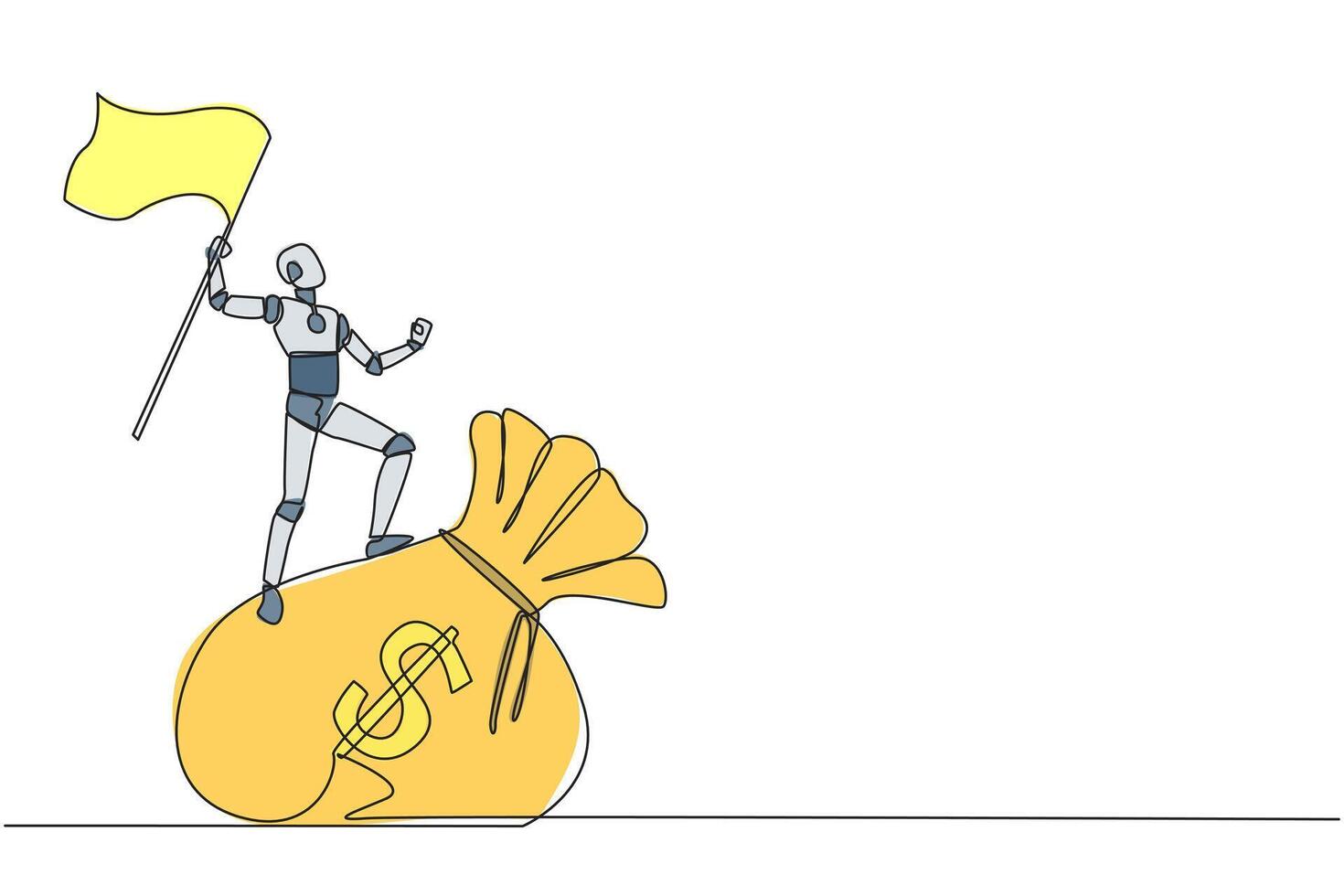Continuous one line drawing of robotic artificial intelligence standing on giant money bag holding fluttering flag. Future technology robot development. Single line draw design vector illustration Pro Vector