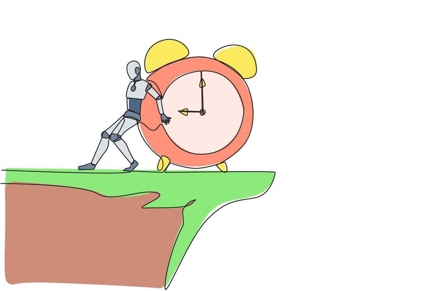 Single continuous line drawing robot pushes giant alarm clock down the edge of the cliff. Robotic artificial intelligence. Future technology development concept. One line design vector illustration Pro Vector