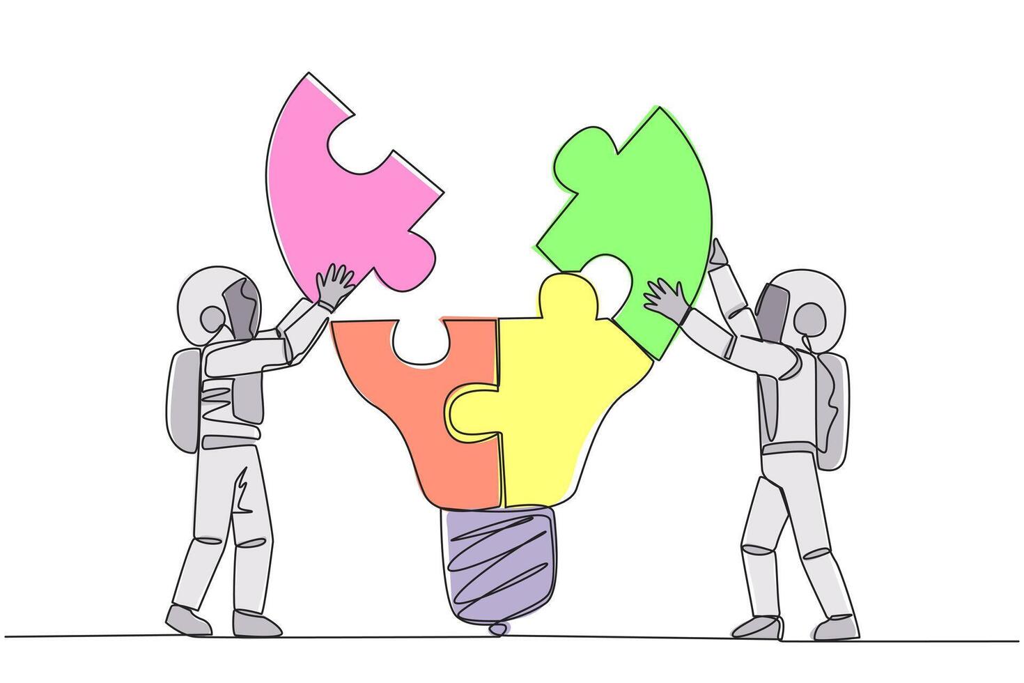 Single one line drawing two astronauts work in teams to complete a lightbulb-top puzzle. Working together to produce brilliant ideas. Teamwork on space. Continuous line design graphic illustration Pro Vector