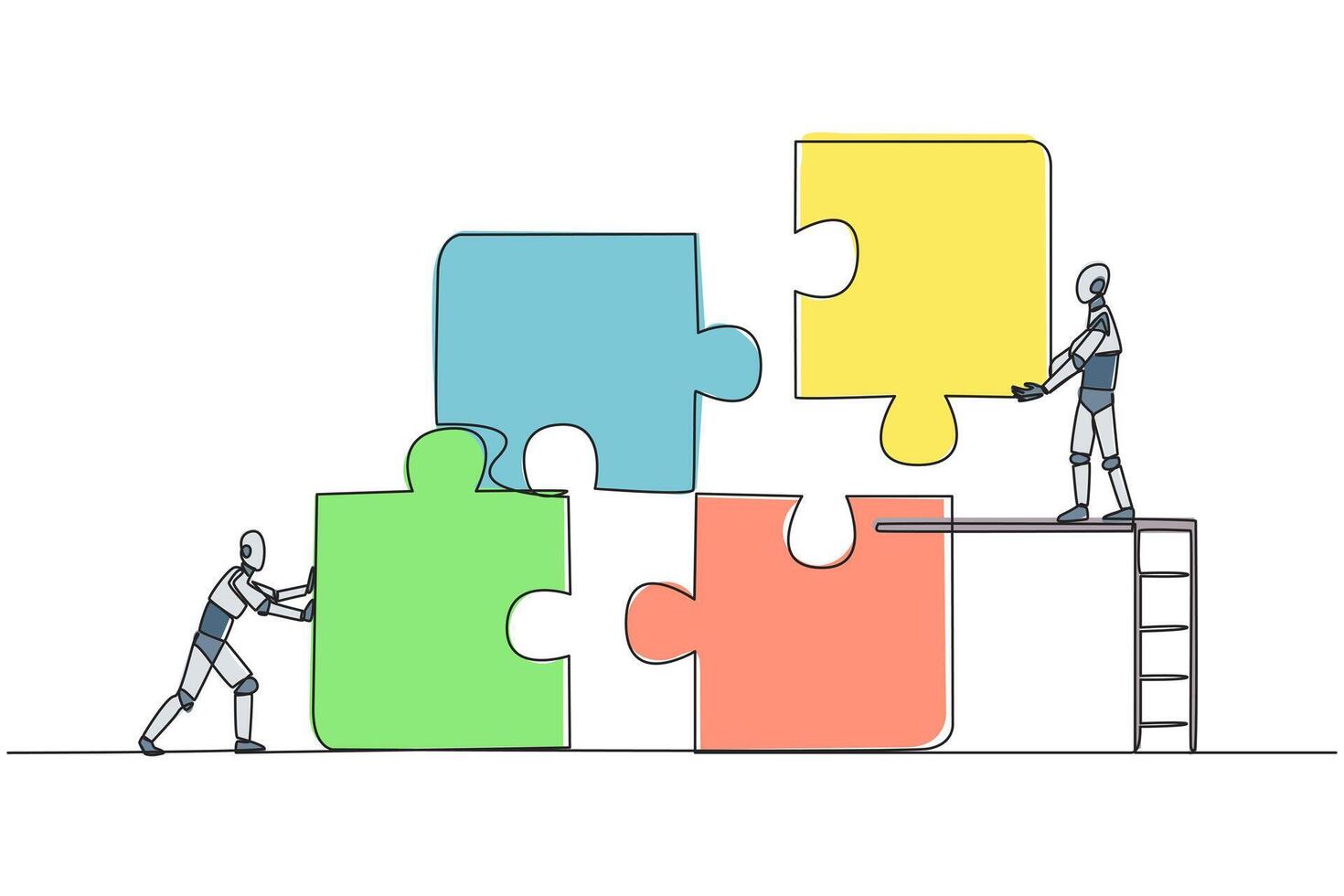 Single continuous line drawing two robots teamwork to put together a square puzzle, one of them climbs ladder holding up a piece of the puzzle. Future technology. One line design vector illustration Pro Vector