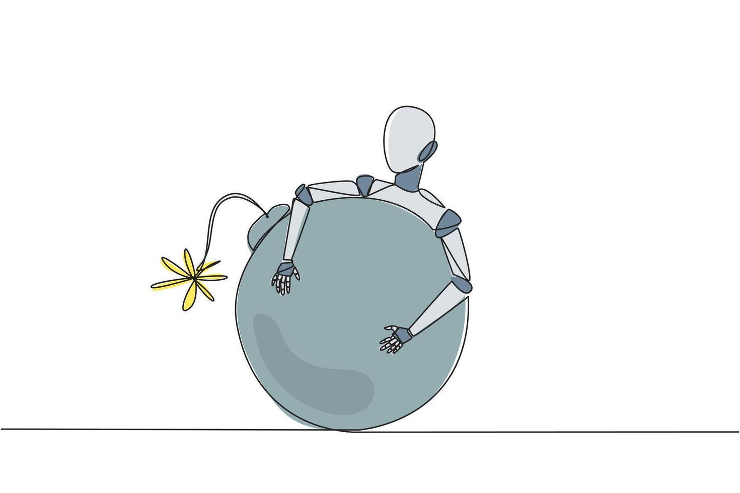 Single continuous line drawing robot hugging large bomb with a burning fuse. Bomb squad robot. Anti riot robot. Artificial intelligence. Future technology concept. One line design vector illustration Pro Vector