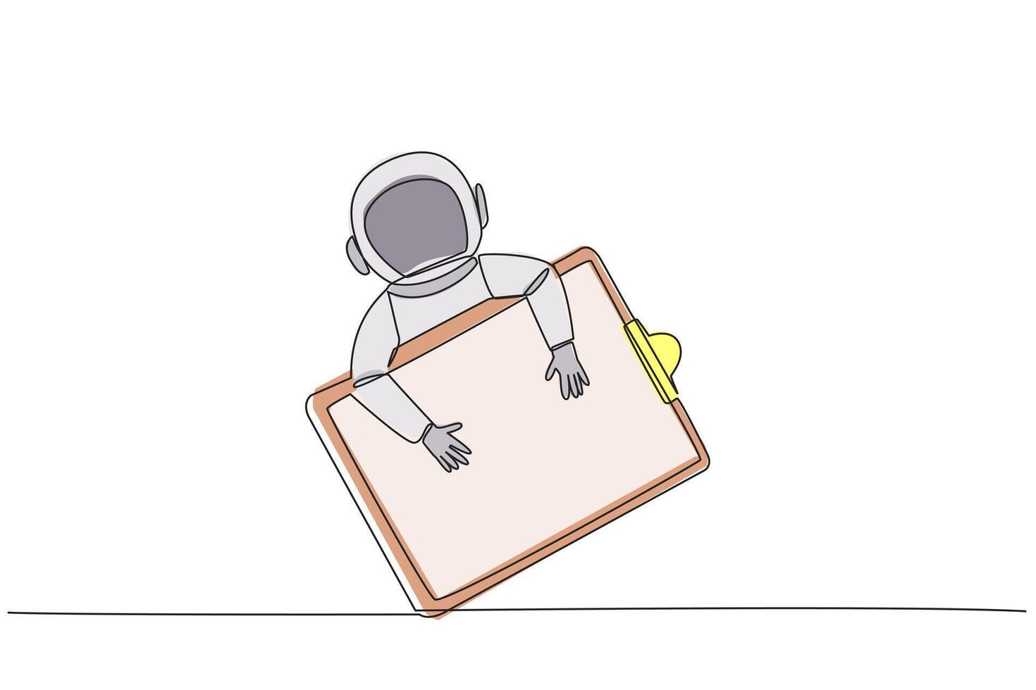 Single continuous line drawing young energetic astronaut hugging clipboard. Keep records of what has been done during the expedition. And do a check. Galaxy cosmic. One line design vector illustration Pro Vector