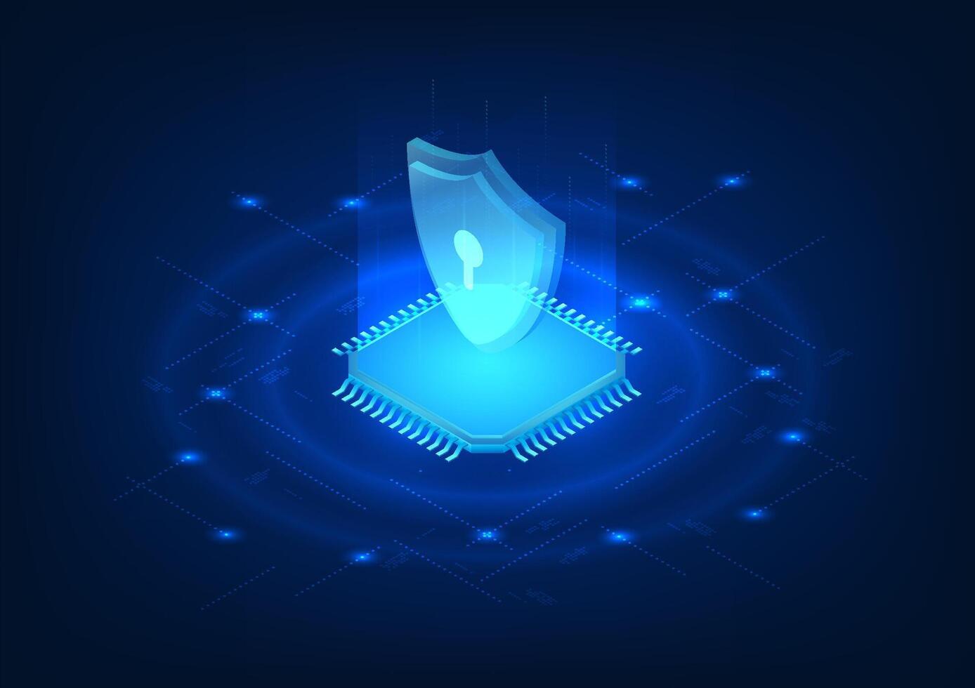Microchip technology equipped with cyber security system Protection against virus threats Data theft and attacks Shield placed on top of microchip pad Vector illustration Pro Vector