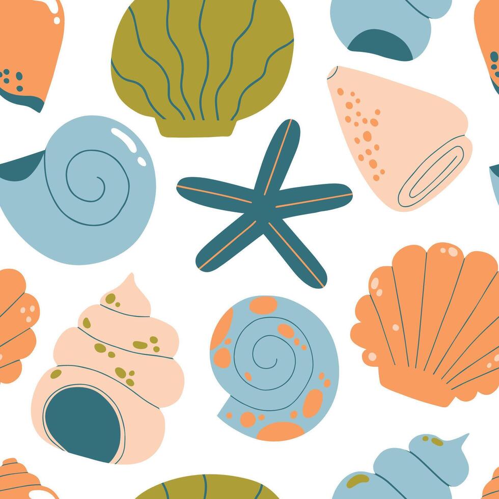 Beautiful seamless vector pattern with hand drawn seashells. Abstract nautical texture with shells and starfish. Underwater coral background Pro Vector