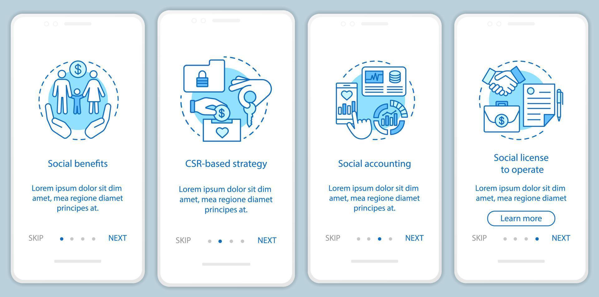 Business ethics onboarding mobile app page screen template. Corporate social responsibility walkthrough website steps. CSR. Social welfare and environment. UX, UI, GUI smartphone interface concept Pro Vector and Pro SVG