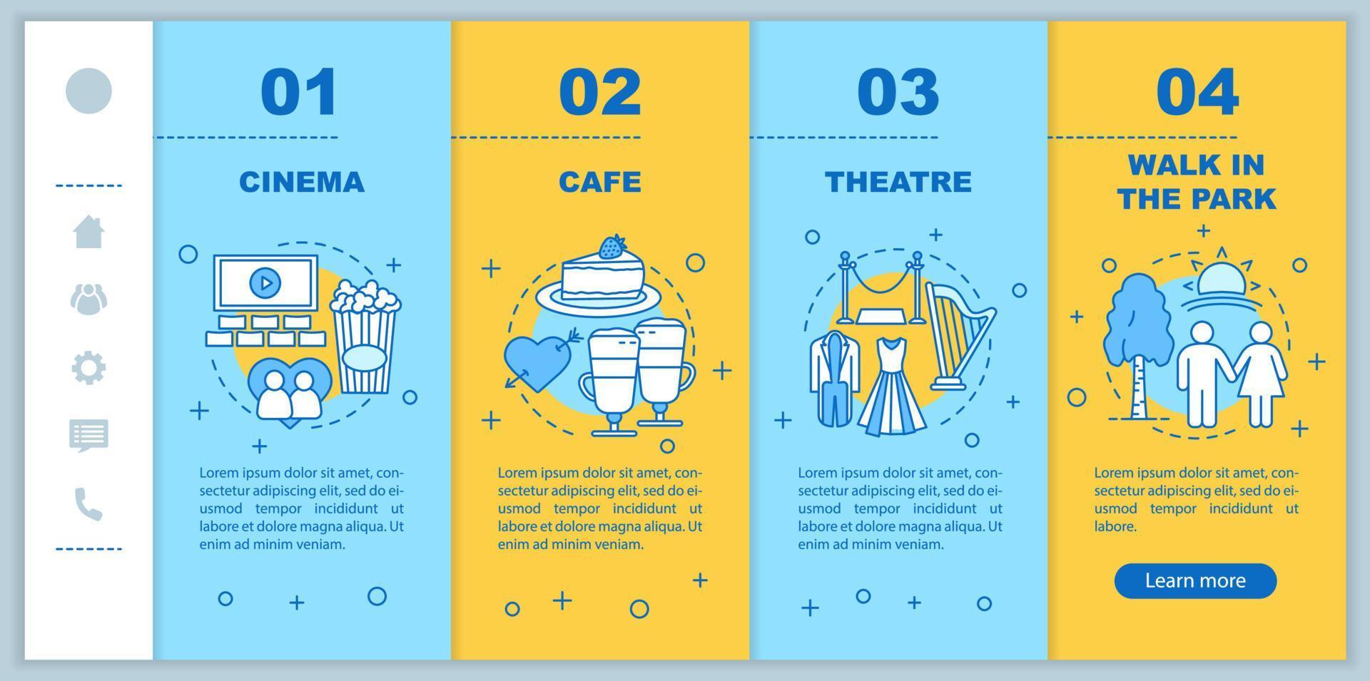 Date ideas app page screen vector template. Romantic relationships development. Places to go on first date walkthrough website with linear illustrations. UX,UI, GUI smartphone interface concept Pro Vector