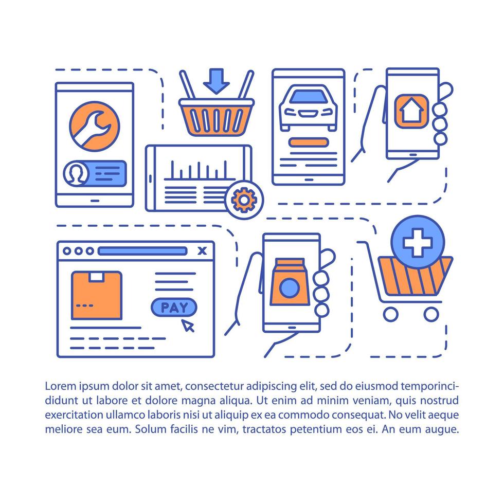 General services marketplace article page vector template. E commerce brochure, magazine, booklet design element with linear icons and text boxes. Print design. Concept illustrations with text space Pro Vector