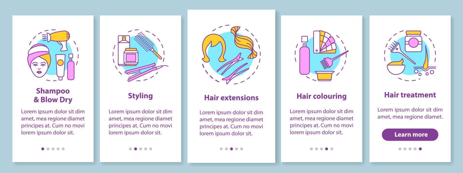 Hairdresser salon services onboarding mobile app page screen with linear concepts. Hair styling walkthrough steps graphic instructions. UX, UI, GUI vector template with illustrations Pro Vector