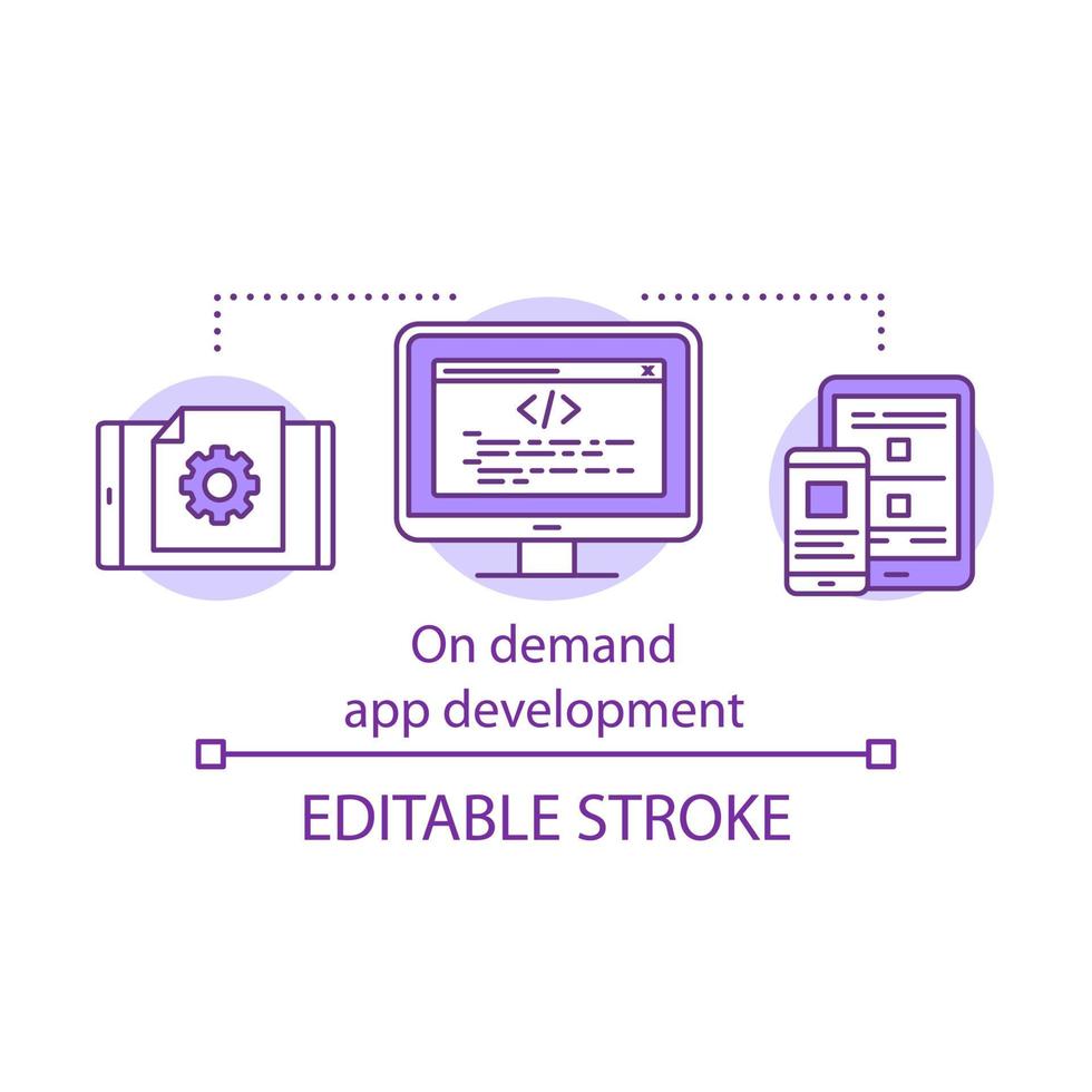 On demand app development concept icon. Software engineering service idea thin line illustration. IT industry. Cross platform file transferring vector isolated outline drawing. Editable stroke Pro Vector
