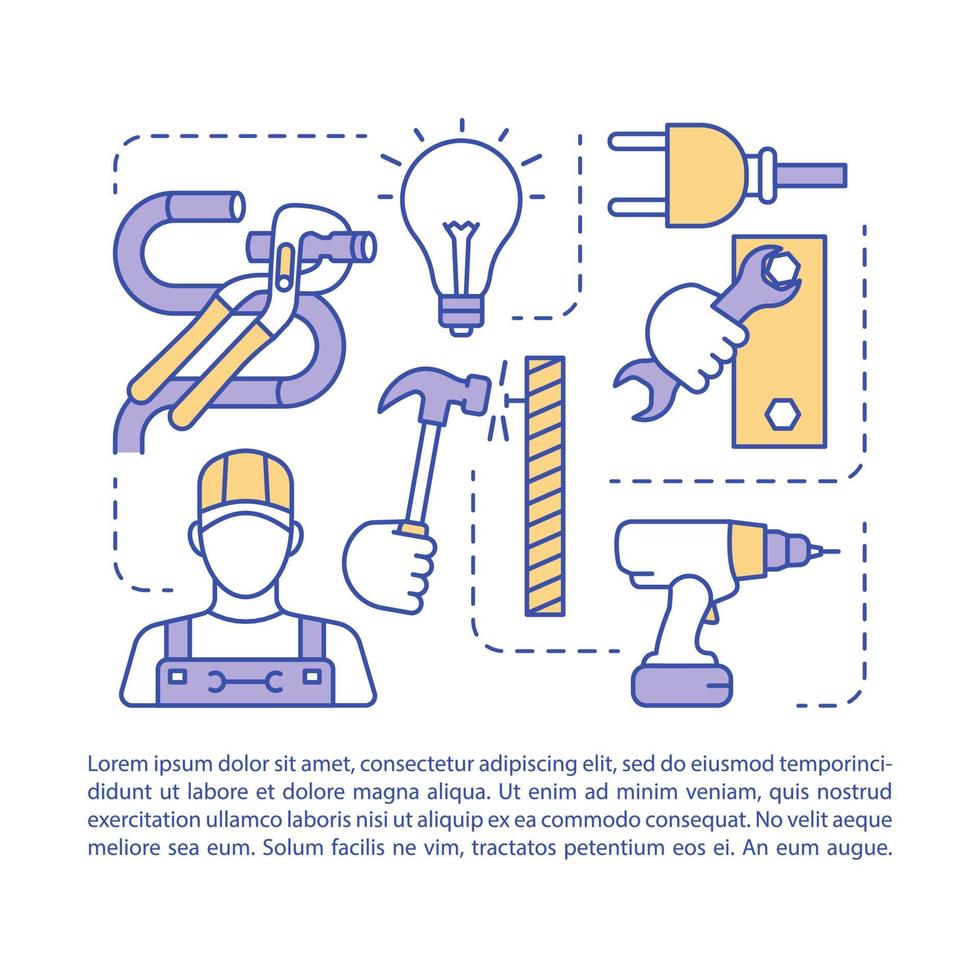 Handyman service article page vector template. Handyperson tools. Brochure, magazine, booklet design element with linear icons and text boxes. Print design. Concept illustrations with text space Pro Vector